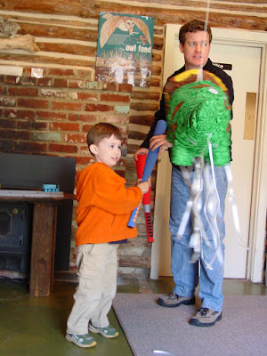 Tonight's picture was taken in April of 2006. This was at Mattie's fourth birthday party which we held at a nature preserve. The theme that year for the party was dinosaurs. As you can see we had a dinosaur pinata and Mattie was going to take the first swing at it as the birthday boy. Do you notice a blue toy train ("Thomas") in the background? Well that was Mattie's train. Mattie never went anywhere without a toy of some sort in his pocket or his hand. He tended to transport cars, trains, stones, and leaves for example and not unlike the sippy cup of milk, these items always landed up in our photos.